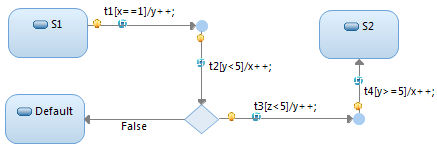 Junction points can be used before, or after a choice point, or both. All guards for transitions compounded by junction points must evaluate to true for that path to be considered enabled. For example, in the following case, x==1 && y < 5 must be true for t1 to fire. Once fired, y and x increment. The behavior reaches the choice point and z<5 && y>=5 must evaluate to true to transition to S2.
