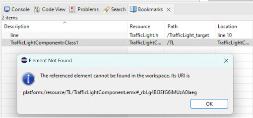 The Bookmarks view has been enhanced to better handle references to elements that are no more available in the workspace. Bookmarks associated with deleted elements or elements from currently closed projects are now automatically removed, helping keep the view clean and relevant. Additionally, if navigation to a bookmark still fails for any reason, a dialog message is displayed informing that the element cannot be found and showing the missing element URI.