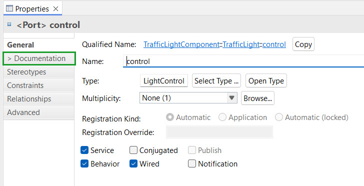 It is easier now to check which of all model elements have associated documentation without clicking through every tab. The "Documentation" property tab now displays a ">" prefix whenever a comment related to documentation is available for a selected model element. This visual cue helps in streamlining the process of finding existing documentation in large models.