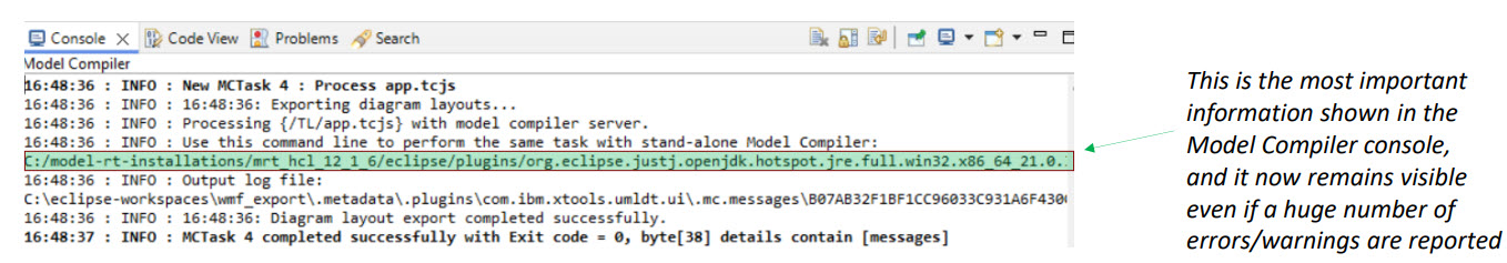 The build output has been reorganized to ensure that critical information remains accessible and visible. Errors and warnings are no longer printed on the Model Compiler console and are now routed exclusively to the UML Development console. This change prevents important build status data from scrolling away in the Model Compiler console, which has a fixed size and cannot be increased. You can still review the full history of errors and warnings in the UML Development console, where the output limit can be adjusted through Preferences → Run/Debug → Console → Limit console output.